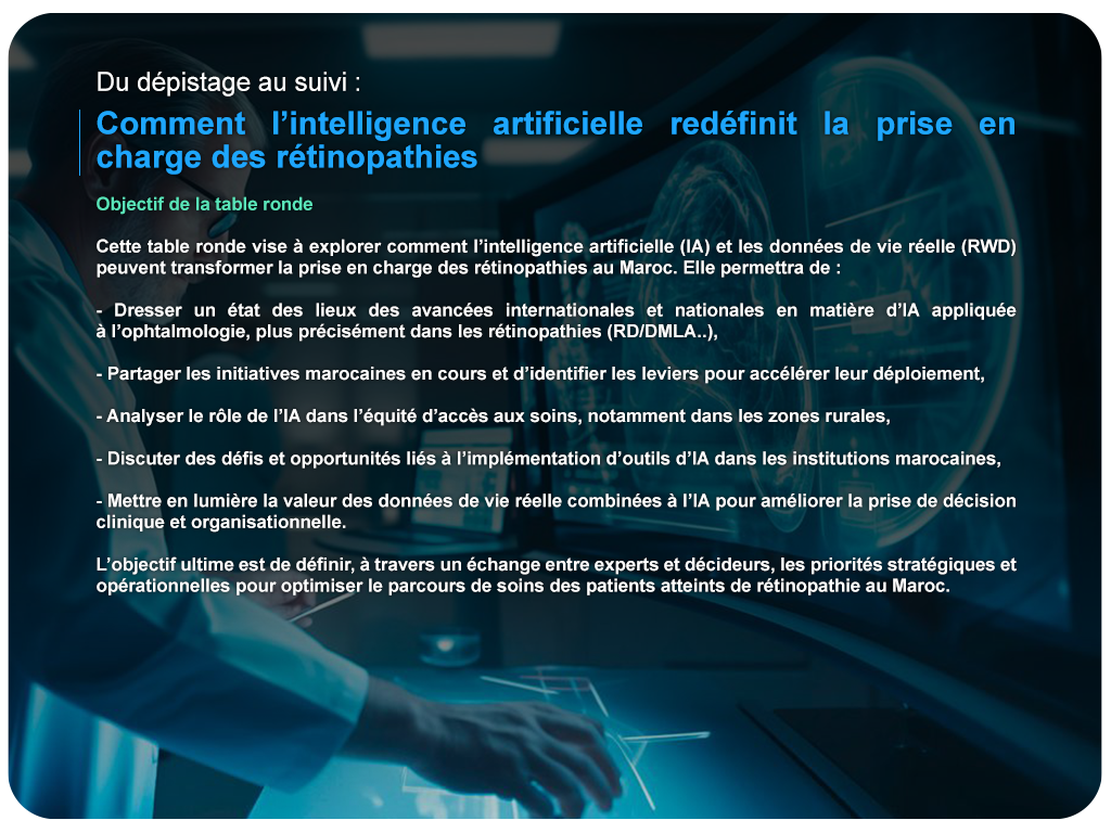 Cette table ronde réunira experts et décideurs pour identifier les leviers prioritaires pour intégrer l’IA et les données de vie réelle dans le parcours du patient atteint de rétinopathie, afin de renforcer l’équité, l’efficacité et la qualité des soins au Maroc